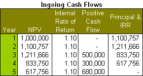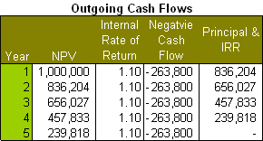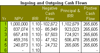 Now we will consider both ingoing and outgoing cash flows. In the beginning of the first year a property is bought and it attracts an annual mortgage interest rate of 10%. This is the outgoing discounted cash flow. However, the property also produces a rental income of $265,605 per annum which is the ingoing cash flow. This income is used to pay off the mortgage until at the end of the fifth year the NPV is again nil. That is, it takes five years for the property to pay for itself.