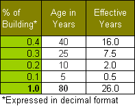 If a building over time has different ages to its part of which some differ in quality and others do not then the effective age of the modernised portions is calculated first, then a weighted age of the entire improvement is calculated.