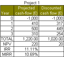 More than one IRR can be found for investment properties with alternating positive and negative cash flows. MIRR finds only one value as it is the weighted average across investment properties.This can be seen by comparing two hypothetical projects below which generate the same NPV on discounted cash flows and the same MIRR but have different IRR. Both projects have the cost of capital and reinvestement at 10%.