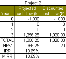 The answer for either project is 10.69%. Note that the MIRR here is lower than the IRR value of 11.11 for project 1.