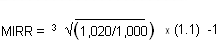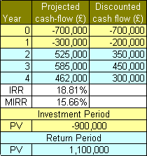 An example is when a plot of land with a derelict building is purchased for $700,000 in the first year and then is refurbished for $300,000 in the following year. The expected return on the investment is discounted over the next 3 years. The cost of capital is 10% and the rate of reinvestment is 10%. In order to deal with this scenario we divide it into an investment phase and a return phase.