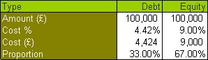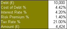 For example, a company acquires an investment property with an interest only non-deposit mortgage of $100,000 which attracts an annual interest rate of 4.2%. The risk premium is estimated at 1.4% and the corporation tax rate is 21%. Using the above formula the annual cost of debt is 4.42% which equates to $4,424.